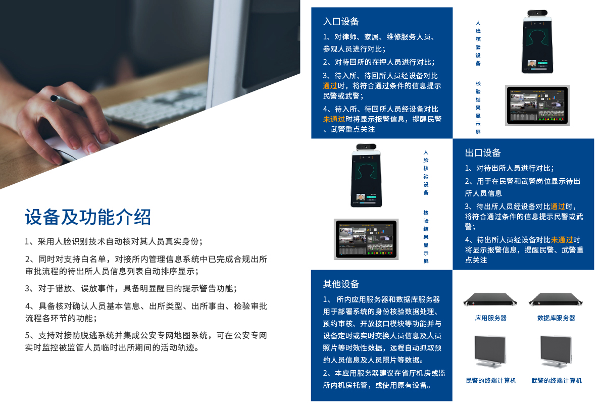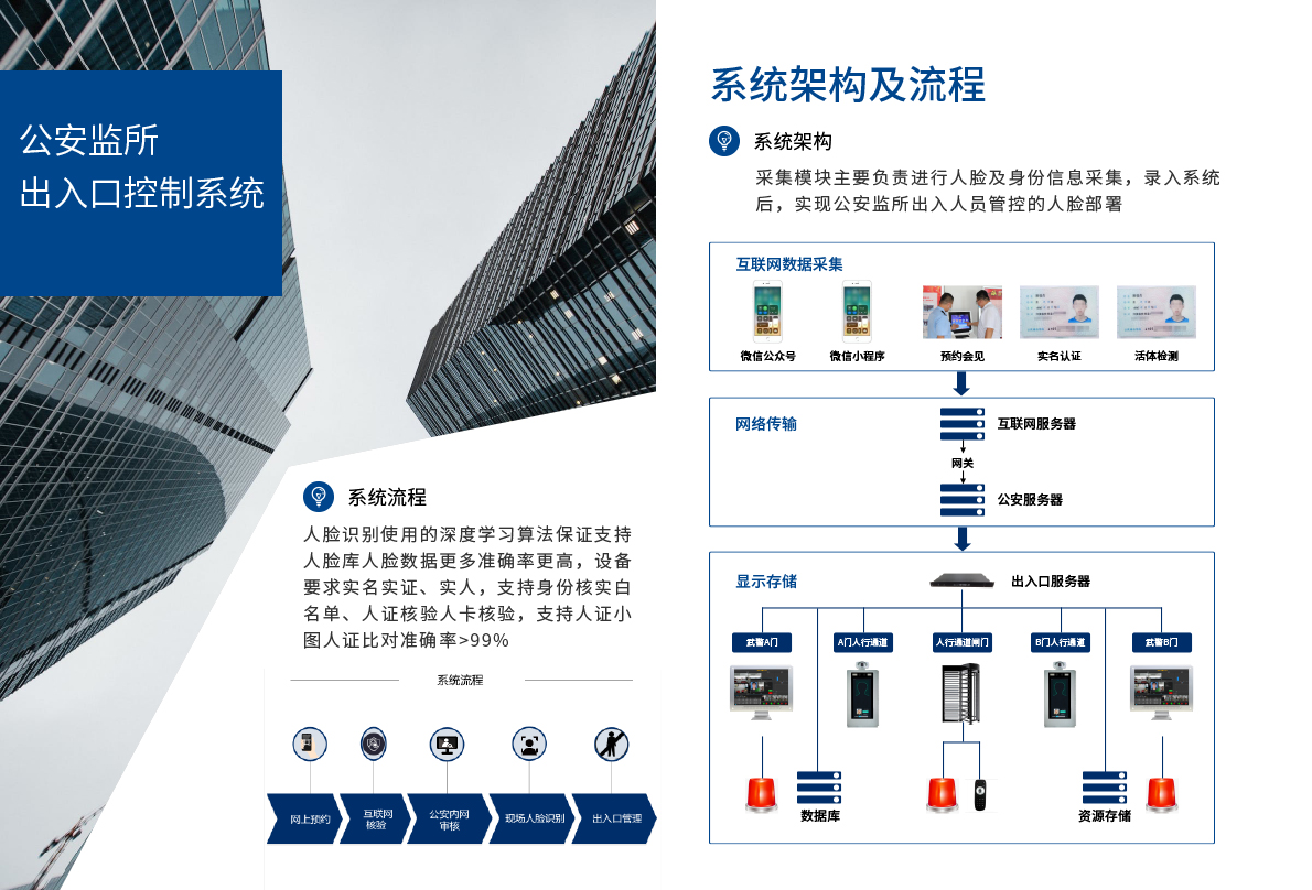 本系统是对临时出入监所的所外人员、出所(临时出所)在押人员全流程管控的系统。实现了对需要到监所会见的律师、家属、维修/服务人员、参观人员的网上预约、监所审核、入所检查、出所控制全流程管理;实现了对出所(临时出所)在押人员的身份核验、出所审核,防止出现“误出所”事件。从而严密监所临时出入口管控,确保监所安全。