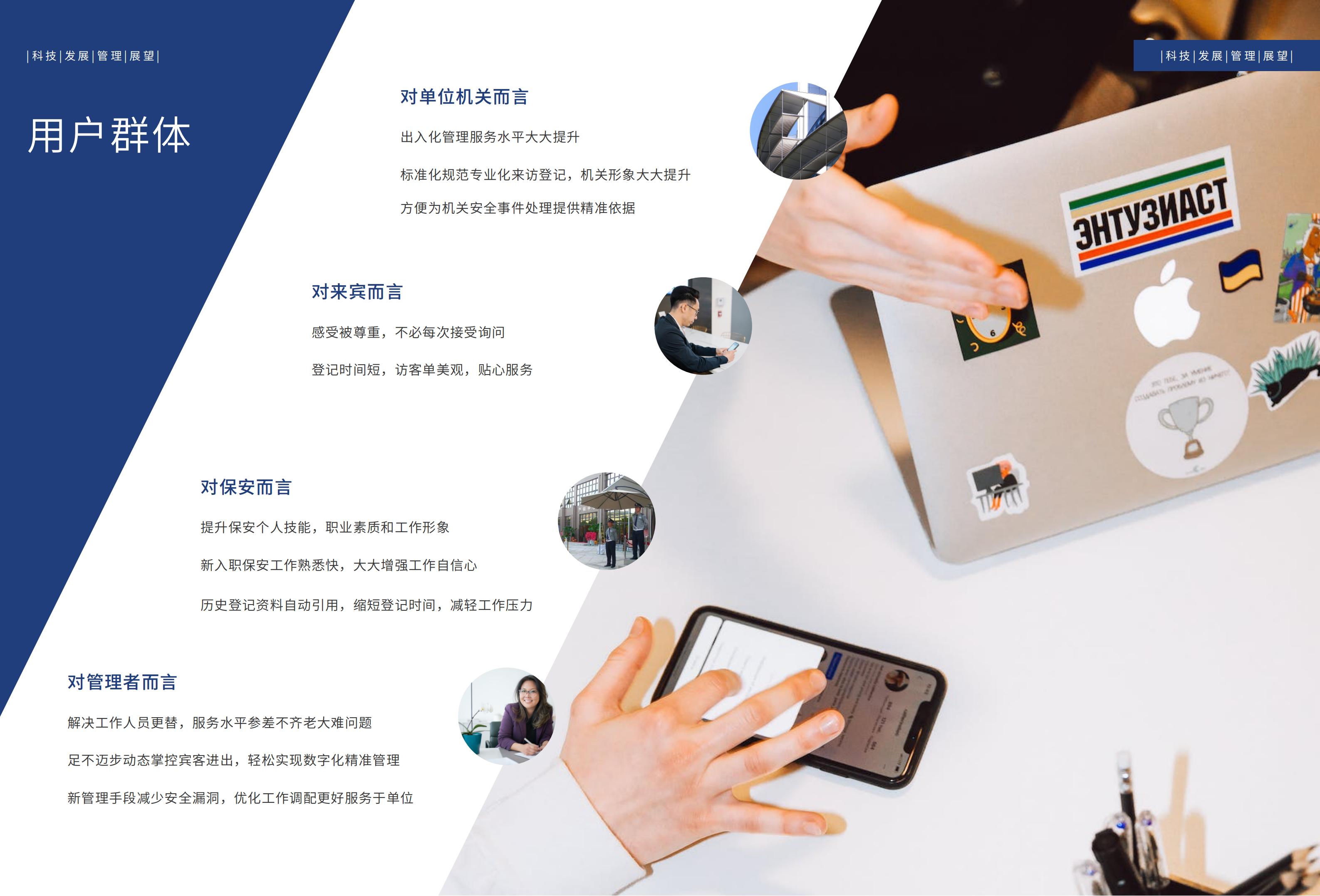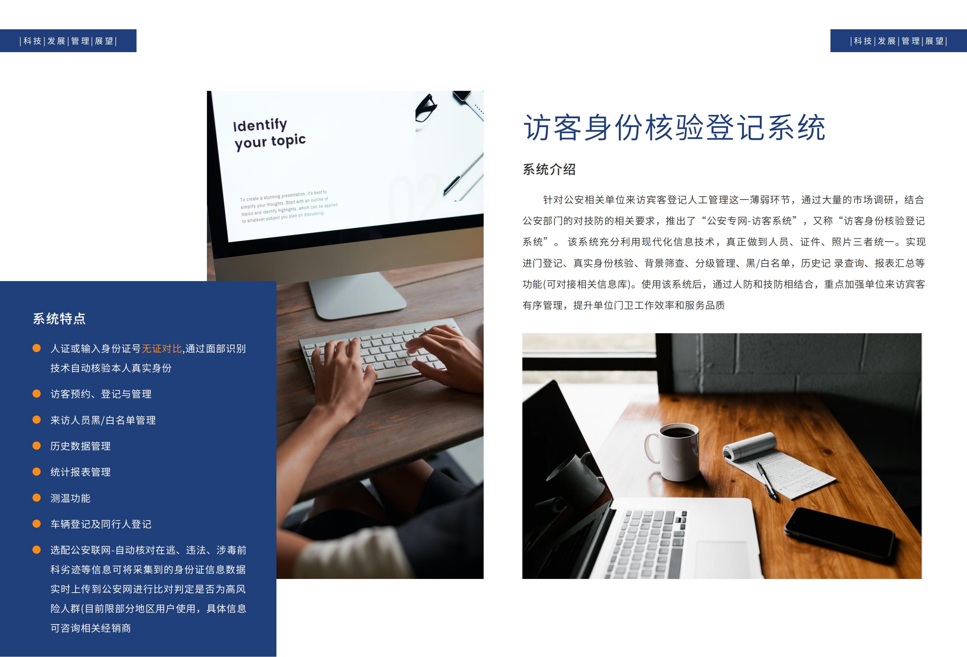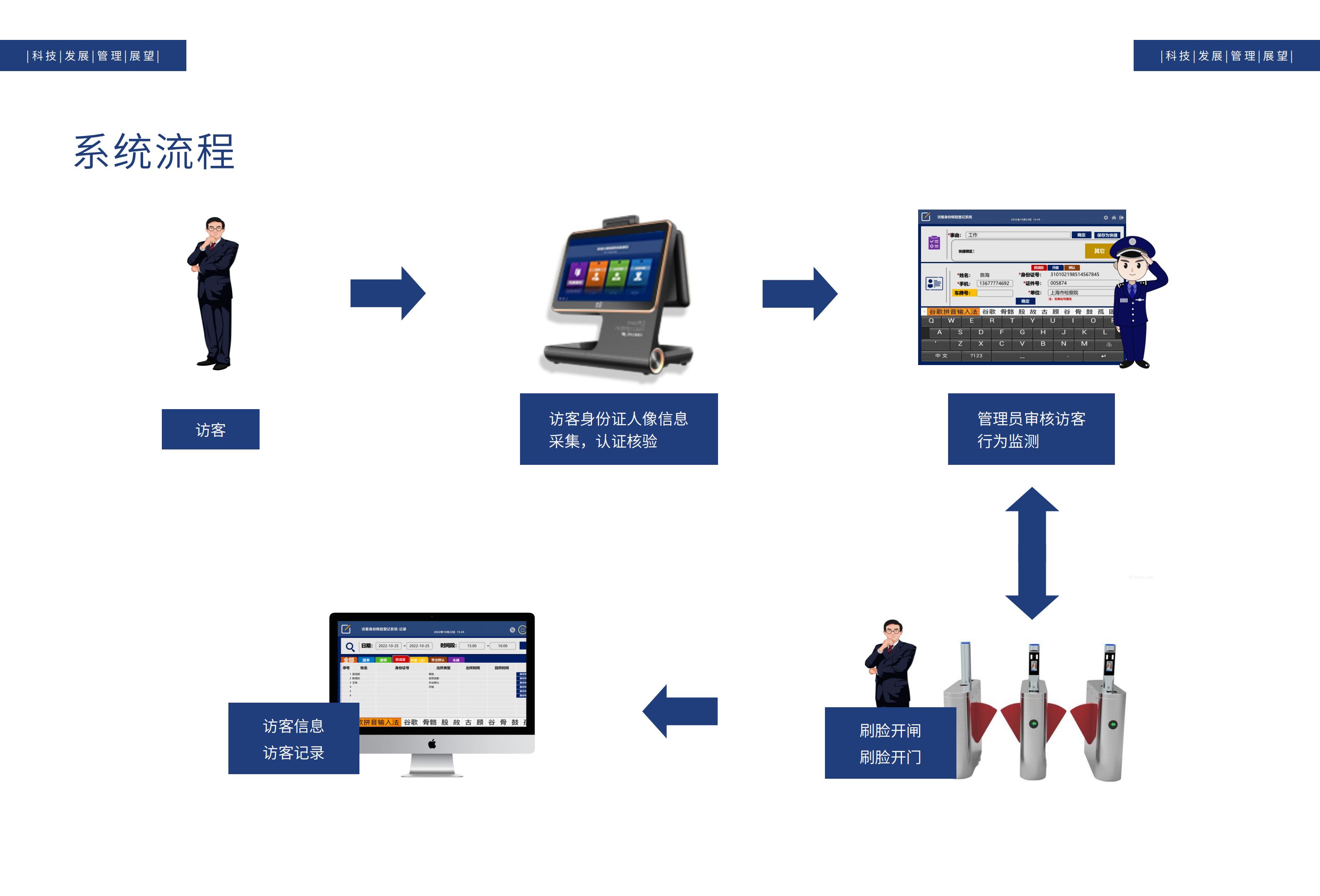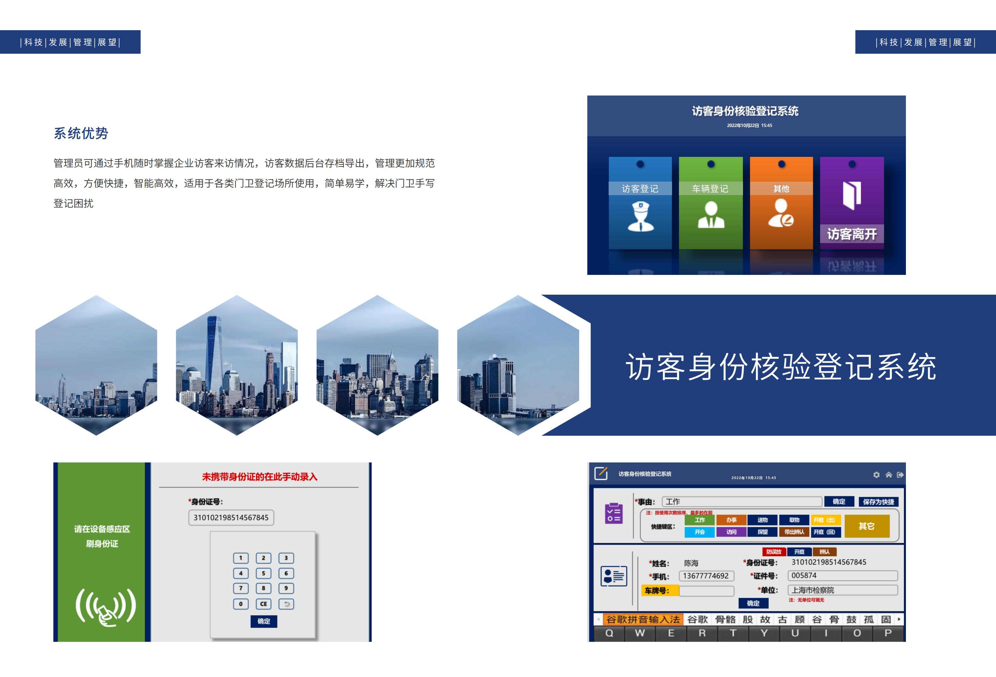 针对公安相关单位来访宾客登记人工管理这一薄弱环节,通过大量的市场调研,结合公安部门的对技防的相关要求,推出了“公安专网-访客系统”,又称“访客身份核验登记系统”。该系统充分利用现代化信息技术,真正做到人员、证件、照片三者统一。实现进门登记、真实身份核验、背景筛查、分级管理、黑/白名单,历史记 录查询、报表汇总等功能(可对接相关信息库)。使用该系统后,通过人防和技防相结合,重点加强单位来访宾客有序管理,提升单位门卫工作效率和服务品质。